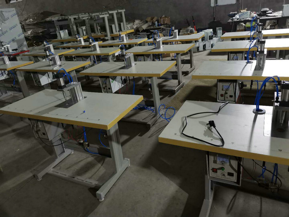 本機以超聲波將綁帶融合于口罩本體兩側(cè),進而完成綁帶式口罩成品,只需一名操作員將口罩片置于超聲波發(fā)生器的頭上,后將綁帶放在口罩片上,腳踏踏板使氣缸向下運動,縫住綁帶和口罩片。